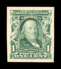 1190 nhu 314 image#314, 1c Blue green imperforate, exceptionally large and even margins all around, strong color and impression, o.g., n.h., an extremely fine gem; 2006 PSE certificate (Superb 98; SMQ $160.00). (Image) $35.00