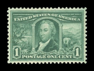 1195 nhu 323 image#323, 1c Louisiana Purchase, an exceedingly choice mint single, possessing symmetrically balanced margins all around, plus its color is especially rich and luxuriant, while its impression is deeply etched, o.g., n.h., an extremely fine gem; 2005 PSE certificate (XF-Superb 95; SMQ $760.00). (Image) $70.00