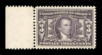1196 nhu 325 image#325, 3c Louisiana Purchase, an exceedingly choice left sheet-margin mint single, marvelously well centered, brilliantly fresh, with deep luxuriant color and an excellent impression, unblemished o.g., n.h., extremely fine; seldom encountered in this gem quality; 2005 PF certificate and a 2005 PSE certificate (XF-Superb 95; SMQ $1,800.00). (Image) $210.00