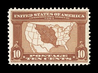 1198 nhu 327 image#327, 10c Louisiana Purchase, the mint top sheet-margin example offered here is one of the finest quality examples to appear at auction in quite some time, featuring mathematically precise centering amid much larger margins than usually encountered, and just as impressive is the stamp's extraordinary overall freshness, with rich luxuriant color and a deeply etched impression, o.g., n.h., a superb gem destined for placement in the finest collection; 2003 PF certificate and a 2005 PSE certificate (Superb 98; SMQ $9,000.00); this is the highest graded awarded to date, being one of only three to have been given this lofty grade. (Image) $400.00