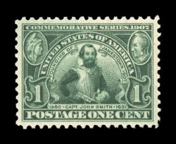 1200 nhu 328 image#328, 1c Jamestown, an amazing quality mint single, possessing lavish margins all around which are most uncommon to this typically tightly margined issue, and it is incredibly well centered within them, intensely rich color and a particularly detailed impression, immaculate o.g., n.h., an extremely fine gem; superb examples such as this are true condition rarities; 2006 PSE certificate (XF-Superb 95 Jumbo; SMQ $660.00 for 95 and $2,000.00 for 98); one of merely two copies to be graded XF-Superb 95 Jumbo by the PSE, the highest grade achieved to date. (Image) $70.00