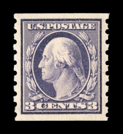 1241 nhu 394 image#394, 3c Deep violet coil, perf. 8 1/2 vert., a highly desirable mint single, possessing perfect centering within unusually large margins, sumptuously rich color and a highly detailed impression on crisp white paper, flawless o.g., n.h., an extremely fine; this coil stamp is especially difficult to find as a gem single; 2006 PSE certificate (XF-Superb 95; SMQ $670.00); only one stamp grades slightly higher (95J). (Image) $130.00