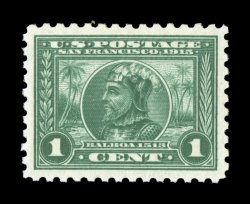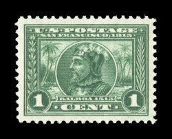 1242 nhu 397 image#397, 1c Panama-Pacific, a magnificent mint single in a quality few others can compare, being perfectly centered within extravagantly large margins, but just as impressive is the stamp's brilliantly rich color and highly detailed impression on pristine white paper, full and intact perforations all around, unblemished o.g., n.h., a superb gem for the most fastidious collector; 2005 PSE certificate (Superb 98; SMQ $950.00). (Image) $45.00