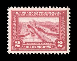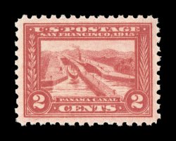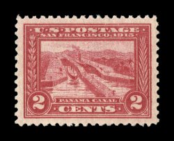 1245 ogu 398 image#398, 2c Panama-Pacific, remarkably well centered within extravagantly large margins, deep intense color and impression, o.g., lightly hinged, extremely fine; 2006 PSE certificate (XF-Superb 95 Jumbo; SMQ $85.00 for 95 and $160.00 for 98). (Image) $20.00
