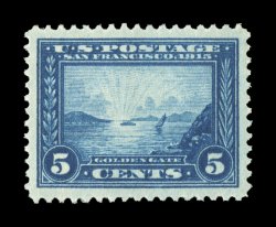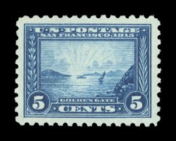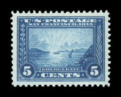 1254 ogu 403 image#403, 5c Panama-Pacific, perf. 10, lavishly large margins all around and being exceedingly well centered within them, bright color and a strong impression on fresh white paper, o.g., lightly hinged, extremely fine; 2006 PSE certificate (XF-Superb 95 Jumbo; SMQ $510.00 for 95 and $970.00 for 98). (Image) $175.00