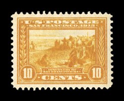1248 ogu 400 image#400, 10c Panama-Pacific, orange yellow, an exceedingly choice quality mint single, flawlessly centered amid especially large margins, bright fresh color and a clean impression, o.g., lightly hinged, an extremely fine gem; 2005 PSE certificate (Superb 98; SMQ $800.00). (Image) $135.00