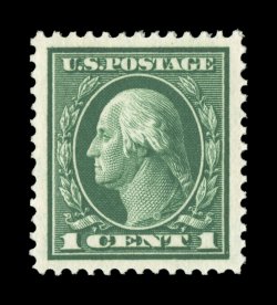 1257 nhu 405 image#405, 1c Green, the "ultimate" mint single, perfectly centered within remarkably wide margins, beautiful rich color and a razor-sharp impression on bright white paper, even its perforations are uniformly intact all around, unblemished o.g., n.h., superb; the perfect stamp for the collector who seeks out stamps in only the finest attainable quality; 2006 PSE certificate (Superb 98 Jumbo; SMQ $670.00 for 98); the sole example (hinged or never hinged) to be graded Superb 98 Jumbo by the PSE, with no other mint stamps grading higher than 95J. (Image) $16.00