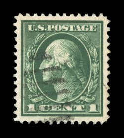 1258 Ou 405 image#405, 1c Green, superb used single, flawlessly centered amid exceptionally large margins, deep intense color and a prooflike impression, light barred oval cancel, an extremely fine gem; 2005 PSE certificate (Superb 98; SMQ $165.00). (Image) $0.25