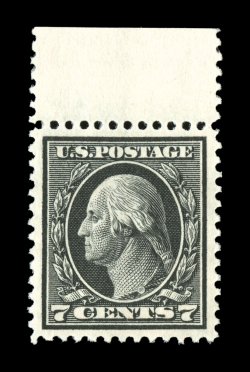 1260 nhu 407 image#407, 7c Black, an extraordinarily handsome top margin mint single, marvelously well centered amid very wide margins, strong rich color and a highly detailed impression on pristine white paper, flawless o.g., n.h., an extremely fine gem; a surprisingly difficult stamp to find in this impressive quality; 2004 PSE certificate (XF-Superb 95; SMQ $1,550.00). (Image) $180.00