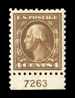 1284 nhu 427 image#427, 4c Brown, a magnificent quality bottom margin plate no. 7263, featuring exceptionally large and absolutely perfectly balanced margins all around, gorgeous rich color and a sharp detailed impression, unblemished o.g., n.h., superb; one of the finest quality examples we have ever offered in our auctions; 2005 PSE certificate (Superb 98; SMQ $2,300.00); this stunning gem has been awarded the highest grade in the PSE population report and is the only example to have been given the lofty Superb 98 designation. (Image) $80.00