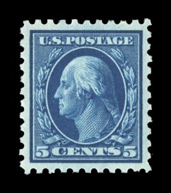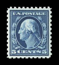 1287 nhu 428 image#428, 5c Blue, marvelously well centered, stunning deep prooflike color and impression on brilliantly white paper, pristine o.g., n.h., extremely fine gem; an especially desirable example; 2006 PSE certificate (XF-Superb 95; SMQ $880.00); this is the highest grade assigned to a never hinged #428. (Image) $80.00