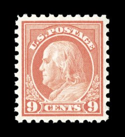 1291 nhu 432 image#432, 9c Salmon red, an incredibly handsome and choice mint single, marvelously well centered, brilliantly fresh color and a sharp impression on pristine white paper, unusually full and intact perforations all around, unblemished o.g., n.h., an extremely fine gem; this is considered the most difficult stamp of the series to find in premium never hinged condition, confirmed by the fact that this is the highest graded example in the PSE population report; 2003 PF certificate and a 2005 PSE certificate (XF-Superb 95; SMQ $1,100.00); ex-Gilbert. (Image) $115.00