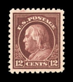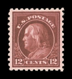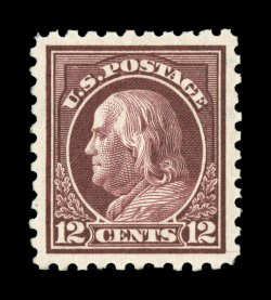 1295 ogu 435 image#435, 12c Claret brown, extraordinarily well centered within unusually large margins, deeply rich color and a highly detailed impression, o.g., lightly hinged, extremely fine; 2004 PSE certificate (XF-Superb 95; SMQ $115.00). (Image) $27.50