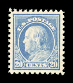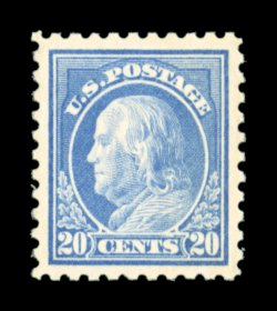 1299 nhu 438 image#438, 20c Ultramarine, a highly select mint single, being in a condition that is far superior to what is typically seen on this value, being remarkably well centered within lavishly large margins, plus its color is exceedingly bright and fresh on clean white paper, unusually even and intact perforations all around, pristine o.g., n.h., an extremely fine gem; 1988 and 2004 PF certificates, and a 2005 PSE certificate (XF-Superb 95; SMQ $3,350.00). (Image) $500.00