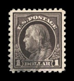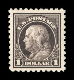 1328 ogu 478 image#478, $1.00 Violet black, an impressively large-margined mint single, possessing lavish margins all around which are rarely found on this high value (this is one of only two stamps to have been given a Jumbo designation by the PSE), extraordinary centering as well, sumptuously rich color and a well incised impression, o.g., lightly hinged, extremely fine; 1991 PF certificate and a 2006 PSE certificate (XF 90 Jumbo; SMQ $1,150.00 for 90 and $2,050.00 for 95). (Image) $800.00