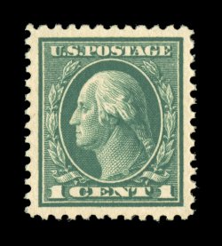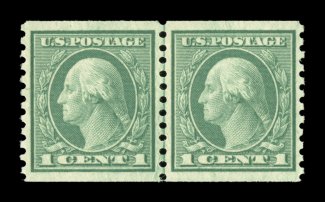 1332 nhu 490 image#490, 1c Green coil, perf. 10 vert., joint line pair, incredibly well centered amid large margins, rich bright color and a strong impression, unblemished o.g., n.h., an extremely fine gem; 2004 PSE certificate (Superb 98; SMQ $200.00); this is the highest grade awarded to any #490, being one of only two line pairs to achieve Superb 98 status. (Image) $7.00