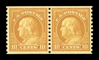 1334 nhu 497 image#497, 10c Orange yellow coil, perf. 10 vert., pair, exceedingly well centered and margined, deep intense color and impression, pristine o.g., n.h., extremely fine; 2005 PSE certificate (XF-Superb 95; SMQ $255.00). (Image) $45.00