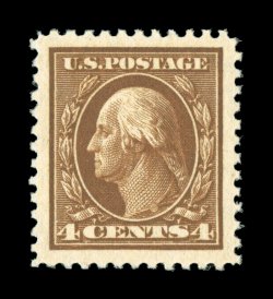 1340 nhu 503 image#503, 4c Brown, an incredible jumbo-margined mint single, featuring the most immense margins imaginable and being perfectly set amid these lavish borders, plus this stamp's color is incredibly intense and rich, with a prooflike impression on brilliantly white paper, pristine o.g., n.h., extremely fine; a striking gem for the collector assembling the finest set possible of the 1917-19 Washington-Franklins; 1998 PF certificate and a 2006 PSE certificate (Superb 98J; SMQ $700.00 as 98); the highest grade awarded to this value by the PSE, being one of only three to have been given this impressive grade; ex-Killien. (Image) $22.50