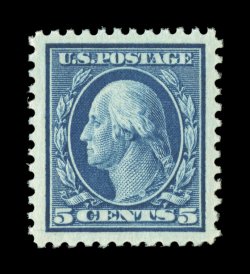 1341 nhu 504 image#504, 5c Blue, marvelously well centered within margins that are considerably larger than typically encountered, beautiful rich color and a vivid impression on especially bright paper, o.g., n.h., extremely fine; an impressive large-margined gem; 2005 PSE certificate (XF-Superb 95 Jumbo; SMQ $220.00 for 95 and $650.00 for 98); this is the highest grade assigned to a never hinged #504. (Image) $20.00