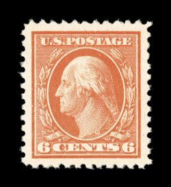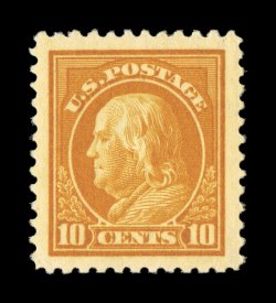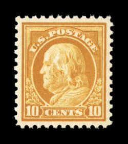 1347 ogu 510 image#510, 10c Orange yellow, a spectacular jumbo-margined mint single, possessing gigantic margins all around and being incredibly well centered within them, dazzling color that is especially bright and intense, o.g., lightly hinged, extremely fine; one of the largest margined stamps from the Washington-Franklin perf. 11 series we have encountered; 2006 PSE certificate (Superb 98 Jumbo; SMQ $115.00 for 98); one of only two mint stamps (both hinged) to receive this impressive grade, the highest awarded. (Image) $17.50
