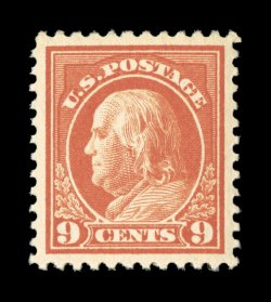 1346 nhu 509 image#509, 9c Salmon red, flawlessly centered within very large margins, gorgeous vibrant color and a strong detailed impression on fresh white paper, o.g., n.h., extremely fine; a pristine gem for the perfectionist; 2004 PSE certificate (Superb 98; SMQ $890.00); only one stamp grades higher (the ex-Killien 98J). (Image) $30.00