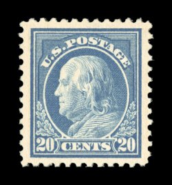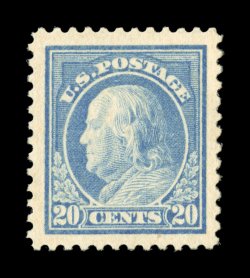 1353 ogu 515 image#515, 20c Light ultramarine, perfectly centered within particularly large margins, strong rich color and a crisp impression, o.g., lightly hinged, extremely fine gem; 2006 PSE certificate (Superb 98; SMQ $210.00); the highest grade to date, being one of only two mint stamps (both hinged) to achieve Superb 98 status. (Image) $45.00