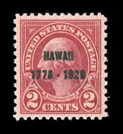 1458 nhu 647 image#647, 2c Hawaii ovpt., excellent centering within lavishly large margins, bright fresh color, o.g., n.h., extremely fine; 2004 PSE certificate (XF-Superb 95 Jumbo; SMQ $115.00 for 95 and $380.00 for 98). (Image) $7.25