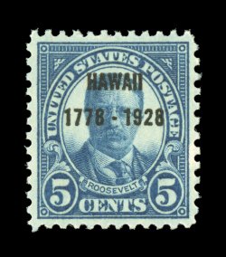 1459 nhu 648 image#648, 5c Hawaii ovpt., gem mint single, absolutely flawless centering, rich luxuriant color and a highly detailed impression, pristine o.g., n.h., extremely fine; 2004 PSE certificate (Superb 98; SMQ $690.00); this is the highest grade awarded to this stamp, being one of only three so graded. (Image) $21.50