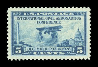 1460 nhu 650 image#650, 5c Aeronautic Conference, a superlative mint single, being one of only three stamps to receive the prestigious grade of Gem 100, absolutely perfect centering within lavishly large margins, deep rich color, pristine o.g., n.h., a superb gem; 2005 PSE certificate (Gem 100; SMQ $280.00 for 98, unpriced in this grade). (Image) $7.25