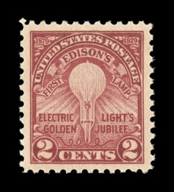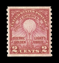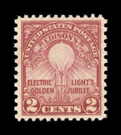 1463 nhu 655 image#655, 2c Electric Light Jubilee, precisely centered within large margins, strong rich color and impression, o.g., n.h., extremely fine gem; 2006 PSE certificate (Superb 98; SMQ $265.00); this is the highest grade achieved to date for Scott #655. (Image) $0.90