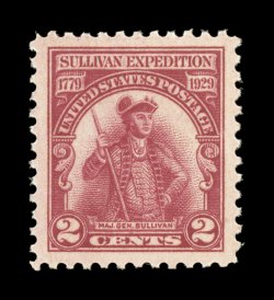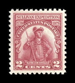 1465 nhu 657 image#657, 2c Sullivan Expedition, an striking jumbo-margined mint single, featuring immense margins all around and being incredibly well centered within them, rich luxuriant color, o.g., n.h., superb; 2006 PSE certificate (Superb 98 Jumbo; SMQ $170.00 for 98); this is the sole example in the PSE population report to receive this impressive grade, the highest to date. (Image) $1.00