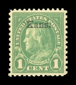1467 nhu 658 image#658, 1c "Kans." ovpt., excellent centering amid large margins, strong color, in addition this stamp has a misplaced overprint, with "Kans." appearing at the top instead of the bottom, o.g., n.h., extremely fine; 2006 PSE certificate (XF-Superb 95; SMQ $95.00). (Image) $4.00