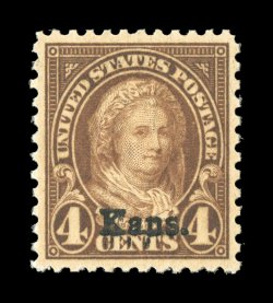 1470 nhu 662 image#662, 4c "Kans." ovpt., incredibly well centered within large margins, deep rich color and a well incised impression, o.g., n.h., extremely fine; an outstanding gem; 2006 PSE certificate (Superb 98; SMQ $1,050.00); the highest grade awarded, being one of only three to have been graded Superb 98. (Image) $37.50