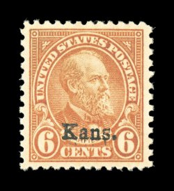 1472 nhu 664 image#664, 6c "Kans." ovpt., remarkably well centered within extravagantly wide margins which are almost impossible to find on stamps from this notoriously tight margined series, strong color and impression, o.g., n.h., an extremely fine gem with few peers; 2004 PSE certificate (XF-Superb 95 Jumbo; SMQ $580.00 for 95 and $1,550.00 for 98); only one stamp grades higher (98). (Image) $55.00