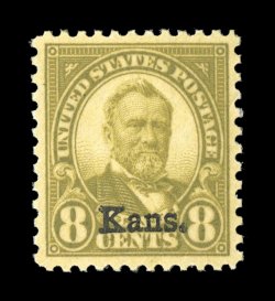 1474 nhu 666 image#666, 8c "Kans." ovpt., an exceptional quality mint single, boasting extravagantly large margins which are almost never encountered on this key value (in fact, this is the only copy in the PSE population report to receive a Jumbo designation), marvelously well centered, gorgeous intense color and a deeply etched impression, flawless o.g., n.h., extremely fine; the perfect stamp for the collector assembling a true gem set of "Kans.-Nebr." overprints; 2006 PSE certificate (XF-Superb 95 Jumbo; SMQ $910.00 for 95 and $2,150.00 for 98). (Image) $180.00