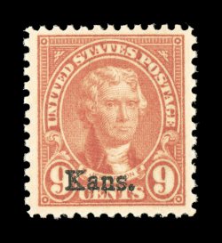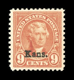 1475 nhu 667 image#667, 9c "Kans." ovpt., exceedingly well centered within lavishly large margins, wonderfully bright and fresh, o.g., n.h., extremely fine gem; rarely encountered both this well centered and margined; 2004 PSE certificate (XF-Superb 95 Jumbo; SMQ $295.00 for 95 and $860.00 for 98); this stamp and the ex-Killien example are the only two #667's to grade XF-Superb 95 Jumbo, the highest graded awarded. (Image) $26.00