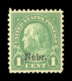 1477 nhu 669 image#669, 1c "Nebr." ovpt., highly select mint single, with perfectly balanced margins all around, strong intense color and impression, pristine o.g., n.h., an extremely fine gem; 2006 PSE certificate (Superb 98; SMQ $355.00); the highest grade to date, being one of only two so graded. (Image) $6.25