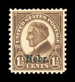1478 nhu 670 image#670, 1 1/2c "Nebr." ovpt., outstanding centering within extraordinarily large margins, deep color and a razor-sharp impression on clean white paper, o.g., n.h., extremely fine; a true gem example; 2006 PSE certificate (XF-Superb 95 Jumbo; SMQ $105.00 for 95 and $345.00 for 98); the sole example in the PSE population report to achieve this grade, the highest given to date. (Image) $5.75