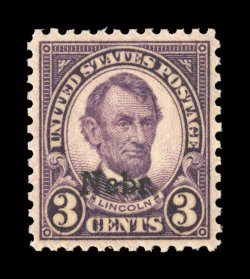 1480 nhu 672 image#672, 3c "Nebr." ovpt., gem mint example, being not only precisely centered within large margins, but its color is incredibly deep and luxuriant, prooflike impression as well, immaculate o.g., n.h., extremely fine; 2006 PSE certificate (Superb 98; SMQ $860.00). (Image) $24.00