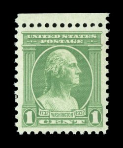 1508 nhu 705 image#705, 1c Washington Bicentennial, a most impressive jumbo top sheet-margin mint single, possessing exceedingly large and perfectly balanced margins all around, beautiful fresh color on bright white paper, immaculate o.g., n.h., a superb gem; 2005 PSE certificate (Superb 98 Jumbo; SMQ $425.00); one of two to grade Superb 98 Jumbo, with just one stamp grading higher (100). (Image) $0.20