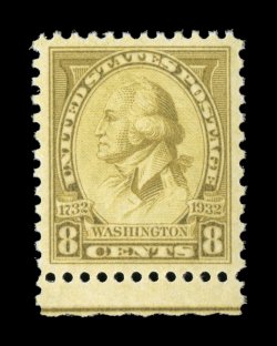 1514 nhu 713 image#713, 8c Washington Bicentennial, the "perfect" bottom sheet-margin mint single, featuring mathematically precise centering amid much larger margins than typically found, especially intense color and impression, pristine o.g., n.h., superb in all respects; a stamp for the collector assembling a set of Washington Bicentennial stamps in only the finest available quality; 2006 PSE certificate (Gem 100; SMQ $610.00); this is the sole example in the PSE population report to be awarded the exalted grade of Gem 100. (Image) $4.00