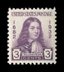 1517 nhu 724 image#724, 3c William Penn, outstanding centering amid exceptionally large margins, incredibly bright and fresh, o.g., n.h., an extremely fine gem; 2005 PSE certificate (Superb 98; not listed in SMQ); the highest grade awarded to this stamp, being one of just two copies to be graded Superb 98. (Image) $0.50