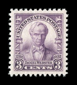 1518 nhu 725 image#725, 3c Daniel Webster, an extraordinarily choice mint single, featuring extravagantly large and perfectly balanced margins all around, deep luxuriant color and a sharp detailed impression on brilliant white paper, o.g., n.h., a superb gem; 2004 PSE certificate (Superb 98 Jumbo; unlisted in SMQ). (Image) $0.50