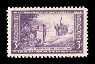 1520 nhu 739 image#739, 3c Wisconsin Tercentenary, incredibly well centered and margined, strong rich color on immaculate white paper, o.g., n.h., an extremely fine gem; 2006 PSE certificate (Superb 98; not listed in SMQ). (Image) $0.40