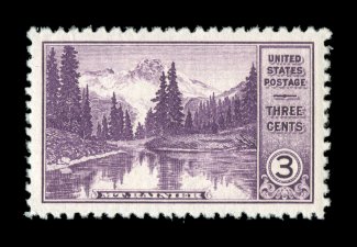 1524 nhu 742 image#742, 3c Mount Rainier, extraordinarily well centered within exceedingly large margins, wonderfully bright and fresh, o.g., n.h., extremely fine; 2006 PSE certificate (XF-Superb 95 Jumbo; SMQ $120.00). (Image) $0.25