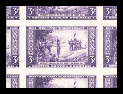 1534 nhu 755/764 image#755-57, 759, 762, 764, 1c-9c Farley imperforates, without gum as issued, six different singles, each carefully cut from a larger multiple so that huge equal portions of the eight adjoining stamps are present, bright fresh colors, a superb group in the ultimate quality; each accompanied by a 2005 PSE certificate grading Gem 100 Jumbo, the highest grade possible (not listed in the SMQ). (Image) $5.40