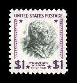 1539 nhu 832b image#832b, $1.00 Purple and black, watermarked "USIR" in error, an incredibly choice mint example, featuring essentially perfect centering amid exceedingly large and precisely balanced margins, remarkably bright and fresh, immaculate o.g. without a single bend or skip, n.h., extremely fine; a superb gem in the finest attainable quality; 2005 PSE certificate (XF-Superb 95 Jumbo; SMQ $330.00); this is the highest grade given to #832b by the PSE. (Image) $175.00