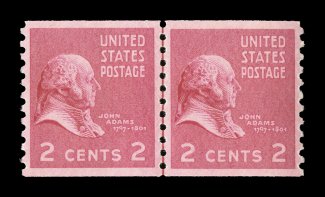 1540 nhu 841 image#841, 2c Rose carmine coil, joint line pair, flawlessly centered, bright fresh color, o.g., n.h., extremely fine; a gem line pair; 2004 PSE certificate (Superb 98; SMQ $160.00); this is the highest grade awarded to this stamp, as well as being the sole line pair to achieve Superb 98 status. (Image) $1.75