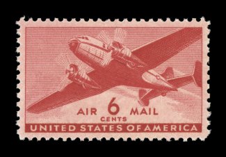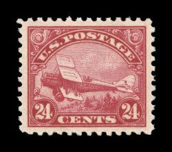 1562 nhu C6 image#C6, 24c Carmine, gorgeous mint single, possessing radiant color and a deeply etched impression on fresh white paper, plus it is incredibly well centered within exceedingly large margins, pristine o.g., n.h., extremely fine; a superb stamp for the collector assembling a true gem collection of airmails; 2002 and 2003 PSE certificates (latter grading Superb 98; SMQ $1,300.00). (Image) $160.00