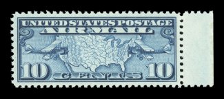 1563 nhu C7 image#C7, 10c Map, an absolutely flawless right sheet-margin mint single, featuring mathematically precise centering amid exceptionally large margins, deep rich color and a razor-sharp impression on crisp bright paper, pristine o.g. without a single bend or skip, a superb gem in every regard; 2005 PSE certificate (Gem 100; SMQ $235.00 for 98); one of only two stamps to receive the coveted Gem 100 grade, the highest awarded to any stamp in this series. (Image) $4.50